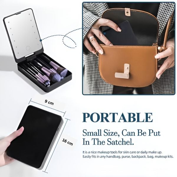 Set četkica i LED ogledalo savršeno se uklapaju u vašu torbu, tako da možete lako popraviti šminku gde god vas dan odvede.